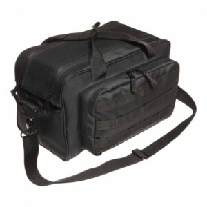 This classic black range bag features a spacious 15 × 8 × 8.5 in main compartment for bulk ammo or gear, plus a 12 × 6 × 1 in exterior pocket for tools, ear protection, or accessories. Three rows of MOLLE loops give you room to attach extra pouches, and it comes complete with a padded pistol rug and a detachable shoulder strap for comfortable carry to and from the range.