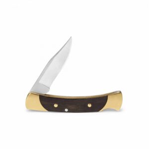 “The 55” by Buck Knives is a compact, traditional lock-back folding knife featuring a 2.375 in (≈6 cm) clip-point blade made of 420HC stainless steel. The handle is crafted with genuine ebony wood scales and brass bolsters, delivering a classic look and feel. Its slim size—about half of Buck’s iconic 110 model—makes it easy to carry daily while retaining sturdy build quality and U.S.-made craftsmanship.