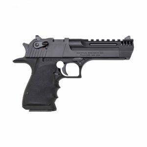 The Magnum Research DE50L5IMB Desert Eagle L5 is a full-size .50 Action Express pistol built for serious stopping power and confident handling. Featuring a 5" black barrel with an integral muzzle brake and Picatinny rail, a black carbon-steel serrated slide, and a black-anodized aluminum frame with a beavertail, this DE50L5IMB ships with a Hogue finger-grooved grip for positive purchase. The 7+1 capacity and rugged construction make it a standout choice for big-bore enthusiasts who want a refined, ready-to-shoot Desert Eagle platform.