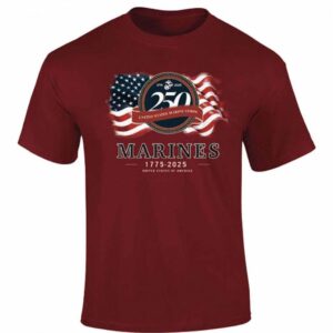 Show your pride for the United States Marine Corps with the U.S. Marines 250th Anniversary Flag T-Shirt—a bold tribute to 250 years of honor, courage, and commitment. Celebrating a legacy that began in 1775, this commemorative design recognizes the enduring strength and sacrifice of the Marines.