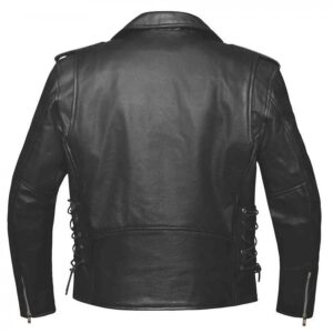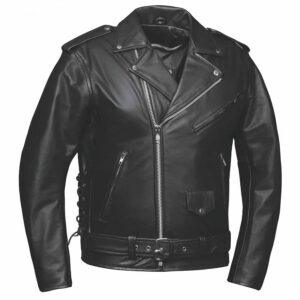Design: Classic motorcycle cut with wide lapel collar and bold styling