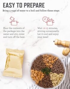 Meat provides protein; rice offers calories and fill. Each pouch portioned (typically 8 servings) and ready in minutes by adding hot or cold water.