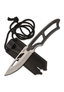 The Master USA Skeletonized Neck Knife is a compact fixed-blade designed for fast-access utility and minimalist carry. Its skeletonized handle reduces weight while preserving grip purchase; the stainless blade resists corrosion for outdoor use, and the included low-profile sheath and neck cord make it an easy, secure option for everyday carry, hiking, or field tasks.