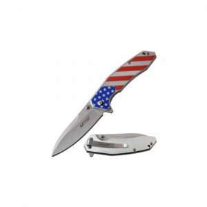This knife combines fast, reliable deployment with proud American-themed styling—giving you a functional everyday folder that also makes a bold patriotic statement. The satin stainless blade and printable/finish-ready flats make it an attractive option for engraving or gifting.