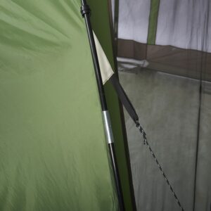 Shock corded fiberglass frame with pin and ring attachment for easy set up.